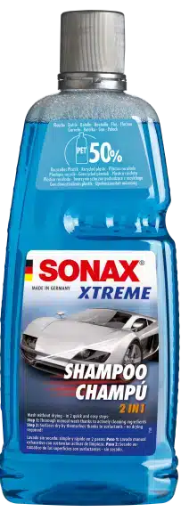 SONAX Xtreme Shampoo 2 in 1 Shampoo with drying support for the manual car wash. Suitable for paintwork surfaces, metal, glass, rubber and plastics. Wash without drying!